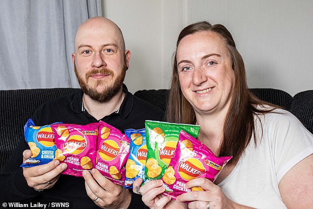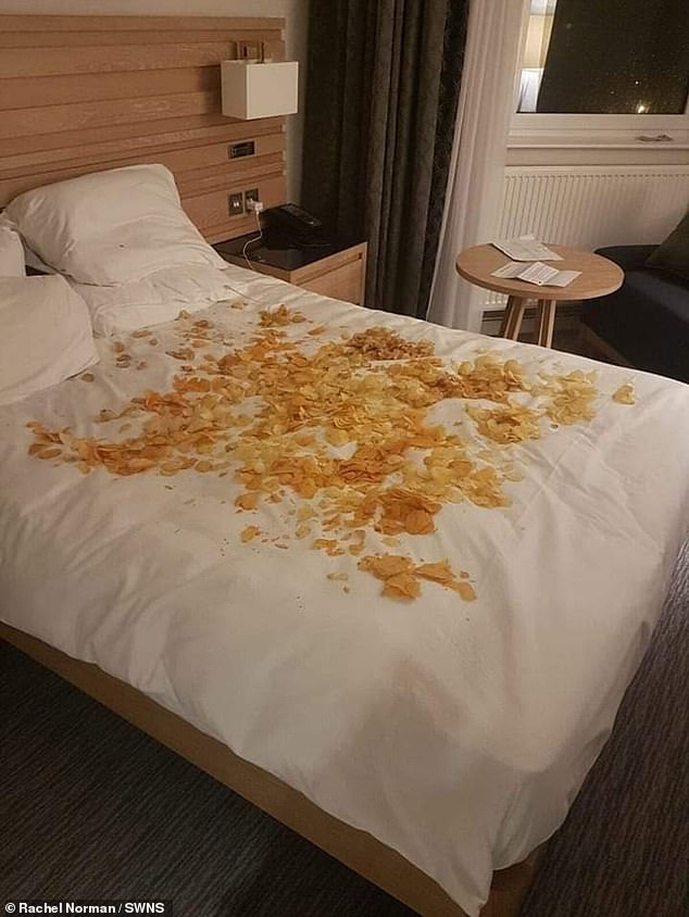 Johnnie Norman, 35, took his wife Rachel, 36, out for her birthday in Blackpool, Lancashire, and secretly asked hotel staff to put 30 assorted bags of crisps on the bed while they were out to surprise his crisp-loving wife.